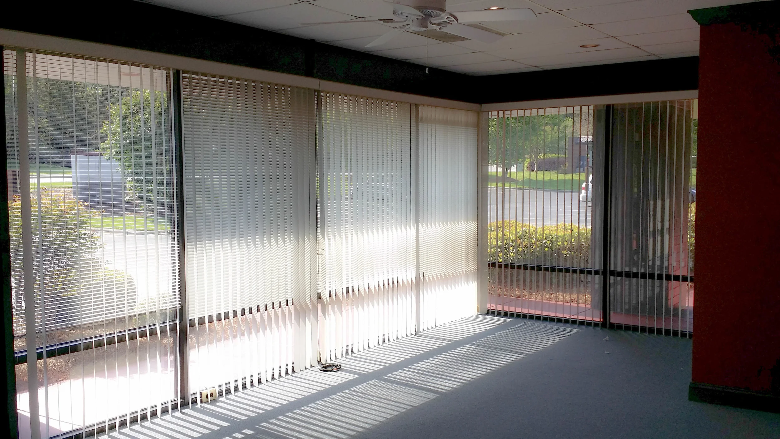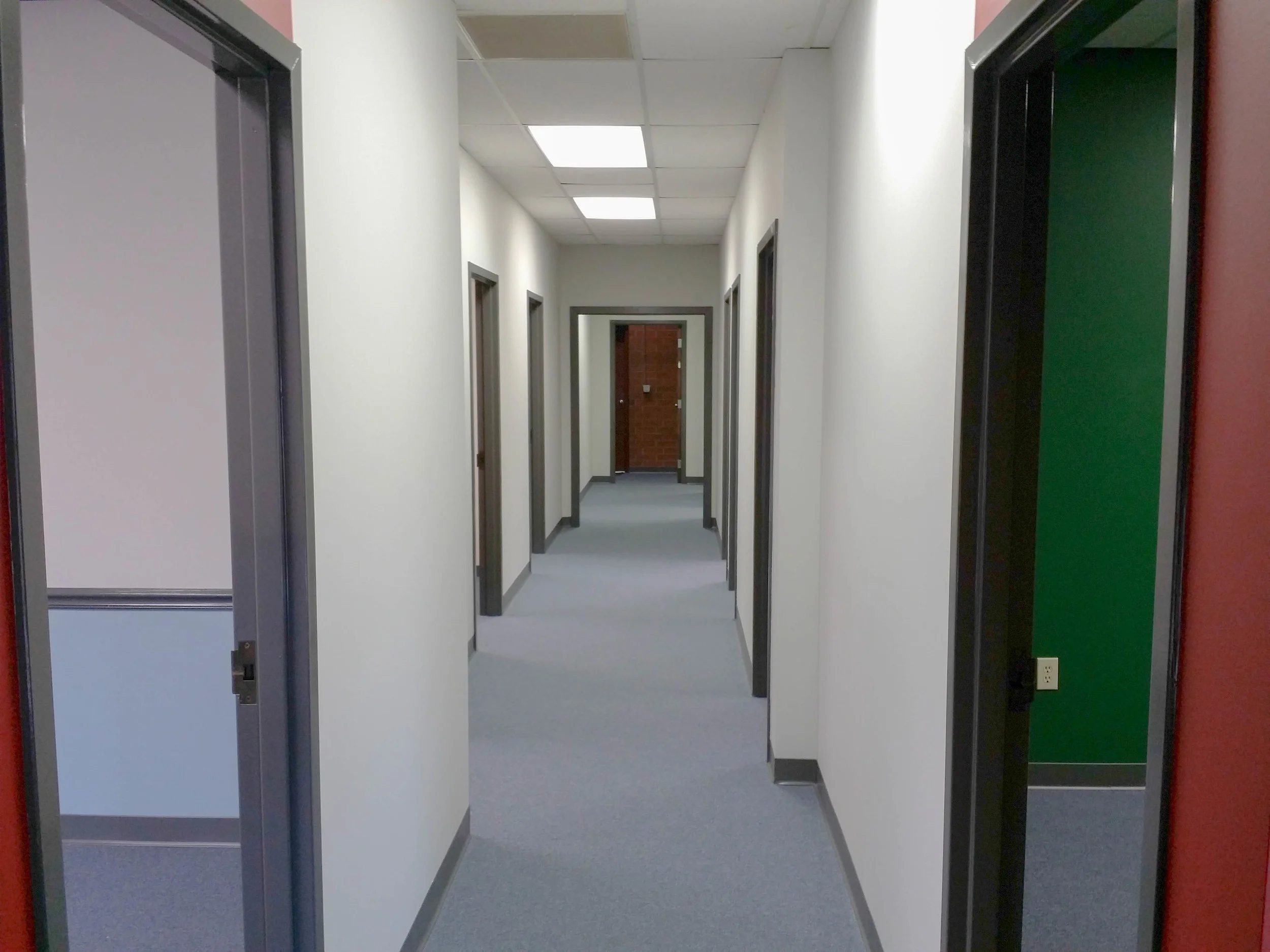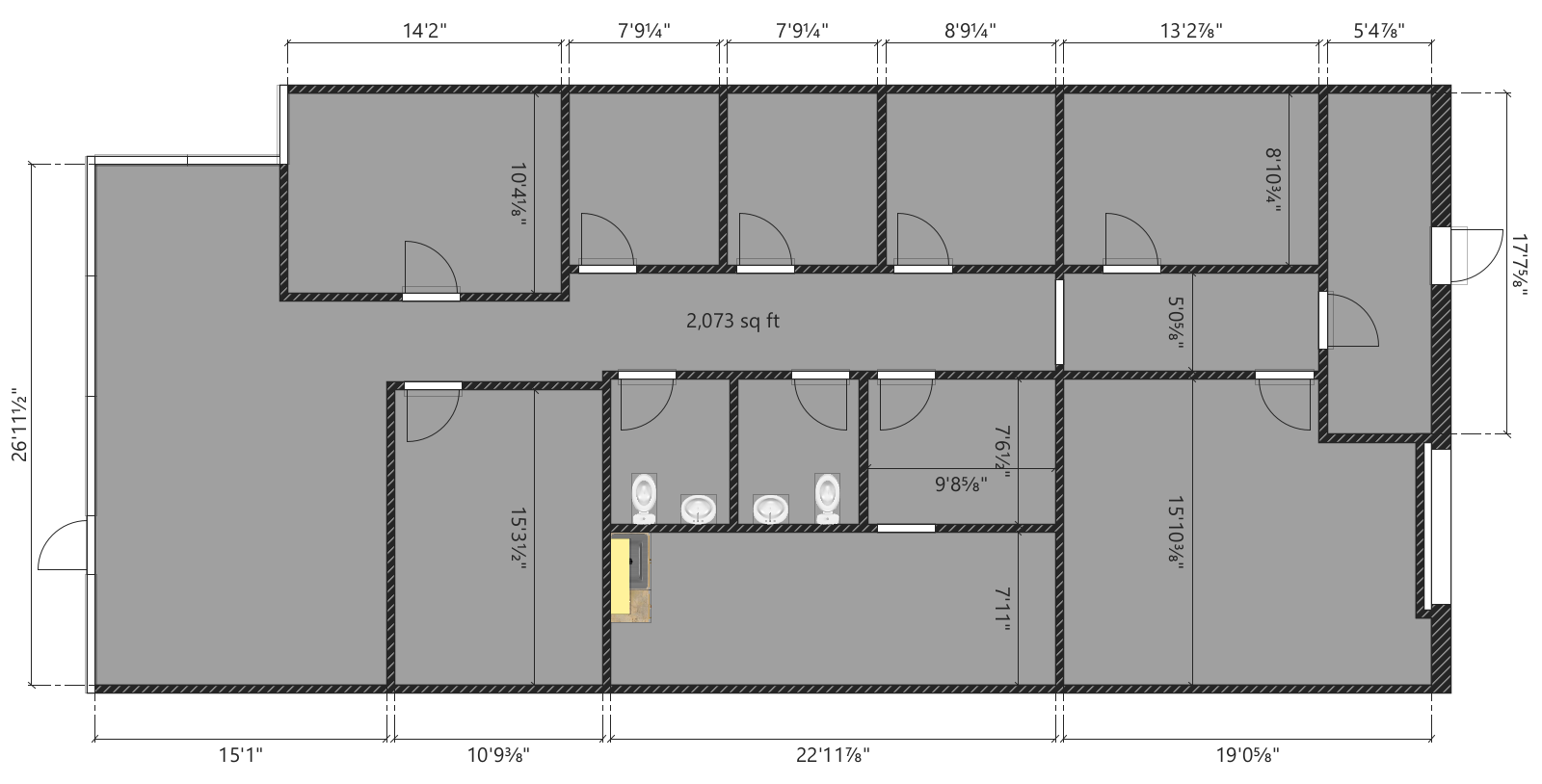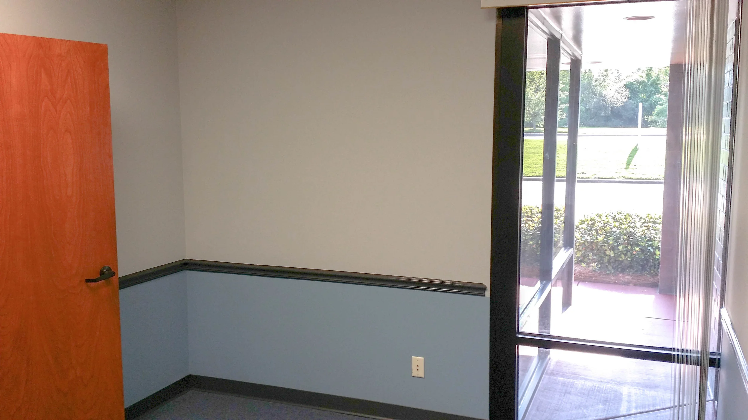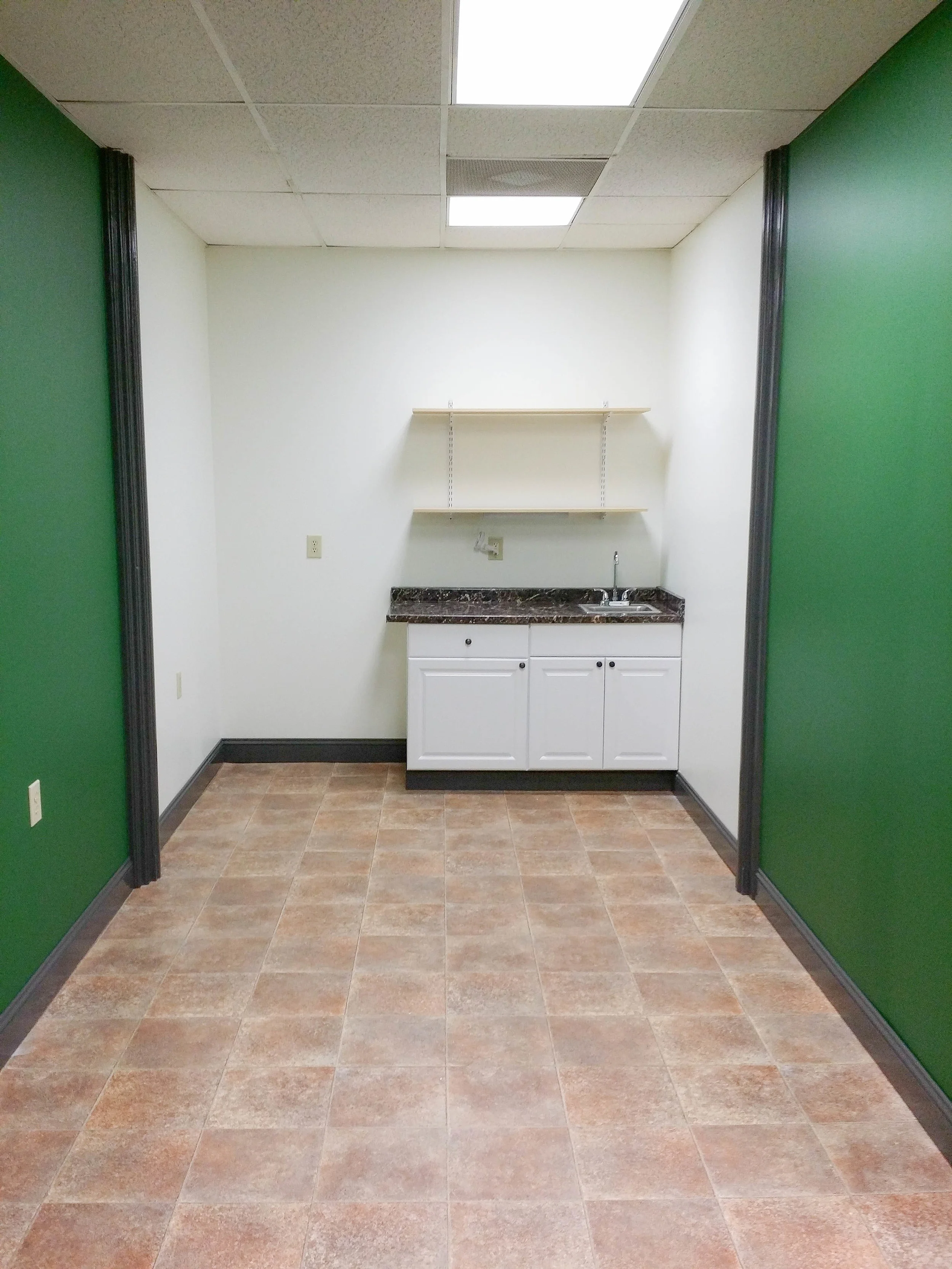 Option 1 has a large front lobby with a corner view, 7 private offices, Men and Women's bathrooms, a large break room/kitchen with adjoining common area and a storage area in the rear.