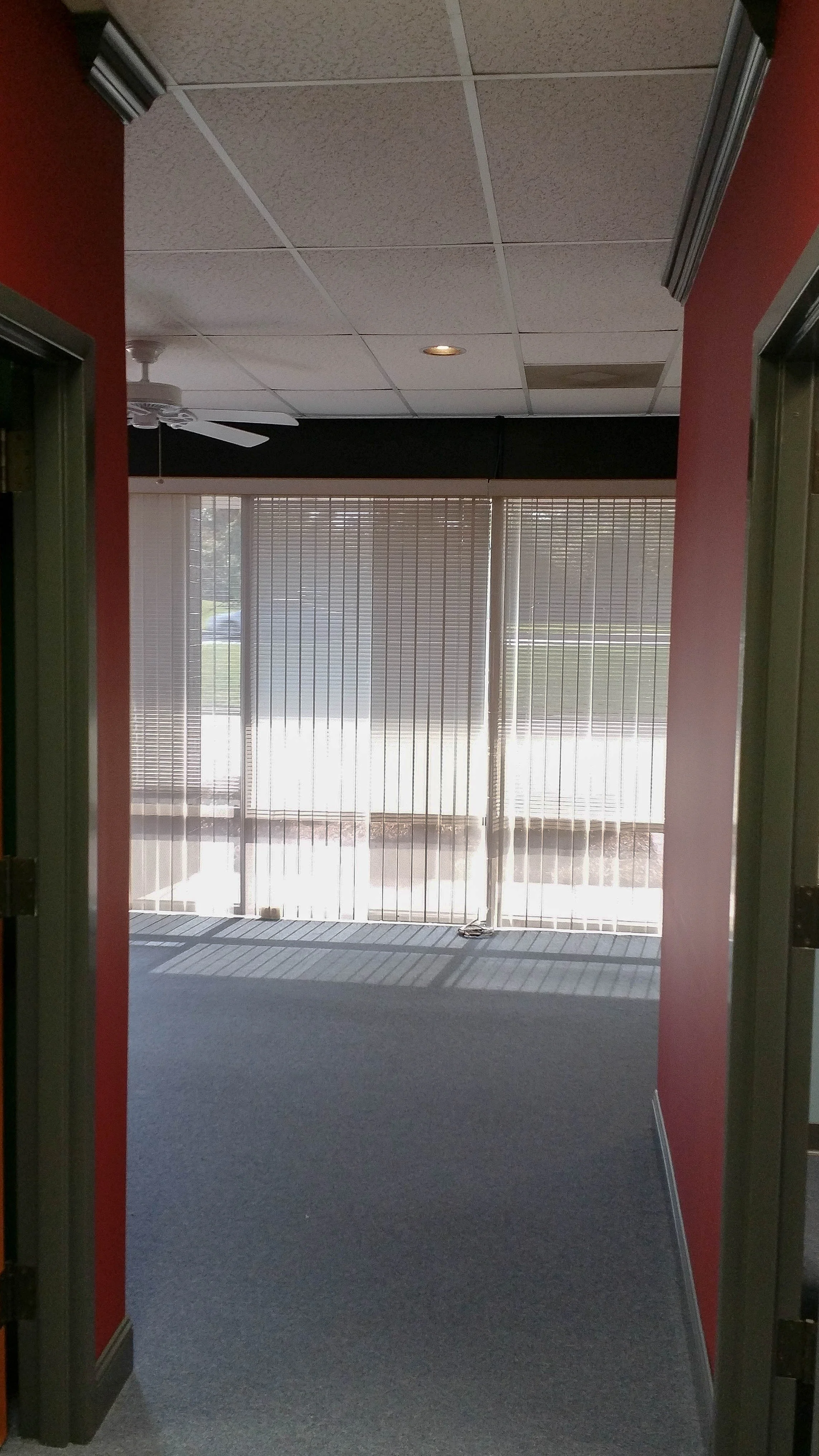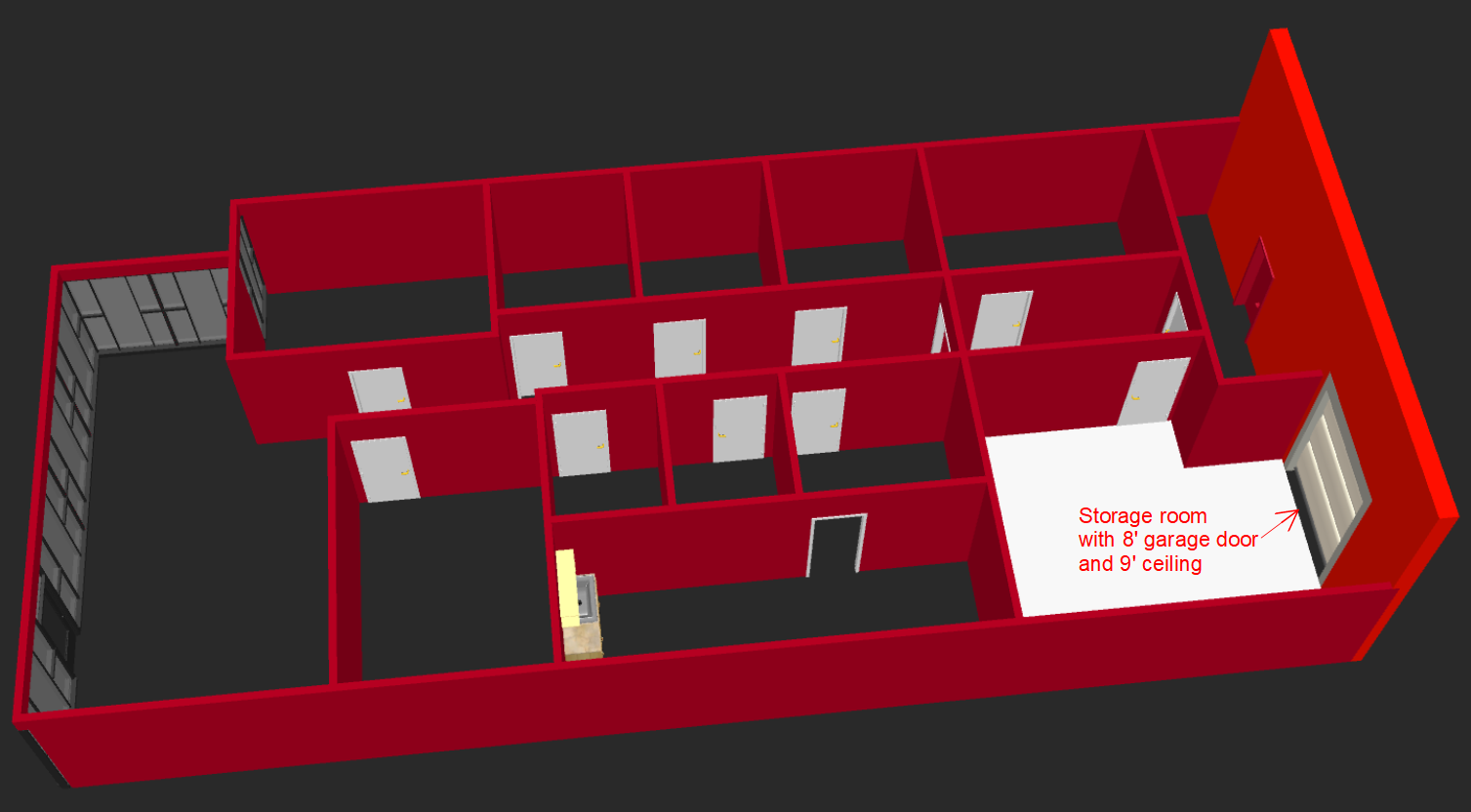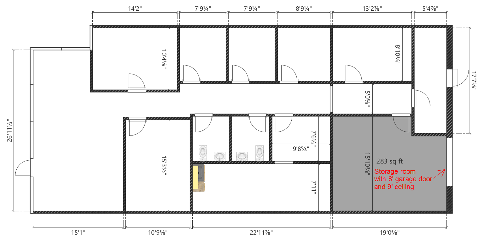 Option 2 transforms the back of Unit E into 283 square feet of storage space leaving the unit with 6 offices.